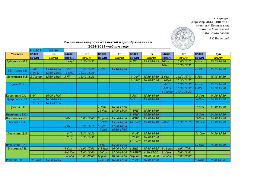 Расписание работы шск "ЮНИОР" в 2024-2025 учебном году